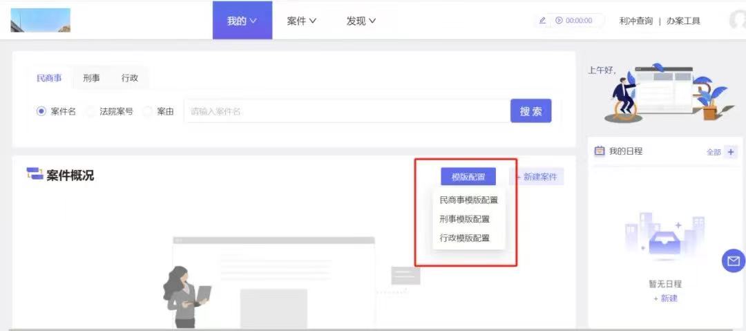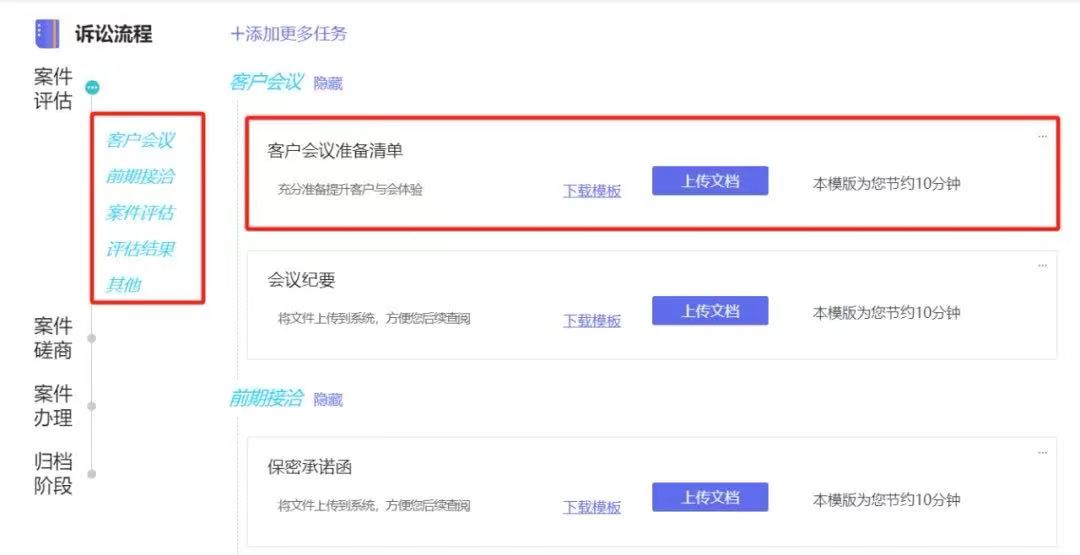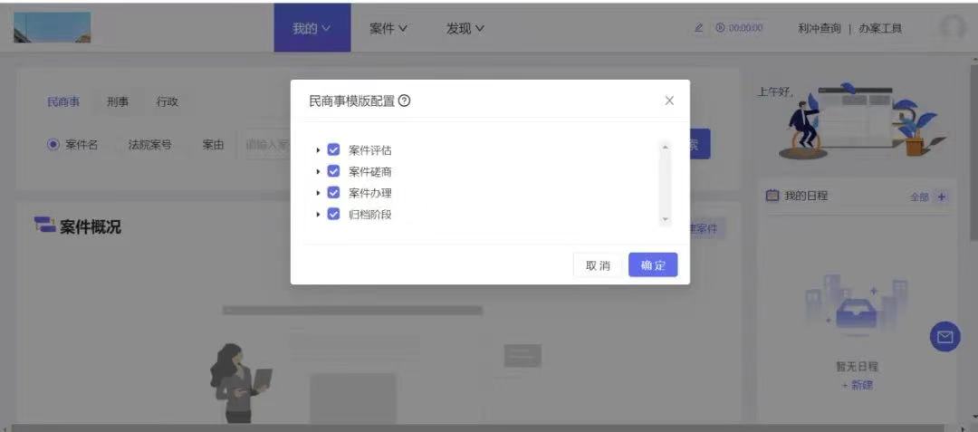 按照天同“41步标准化办案流程”,“天工”系统2.0默认制定了民商事、刑事、行政三大模块配置,但鉴于案件难易程度、律师工作习惯的不同,系统也采用了个性化配置方式,即,用户可以根据自己的使用需求对案件模板进行灵活配置。