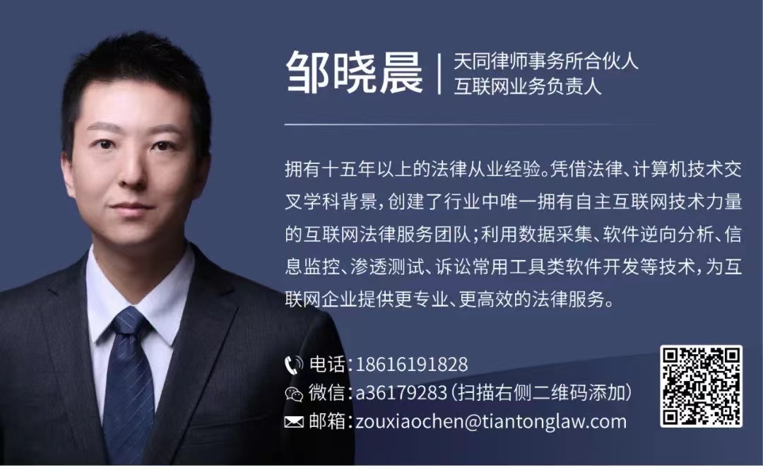 “天同网事”栏目由邹晓晨律师主笔/主持,本栏目深入研究互联网产业中竞争领域、知识产权领域、信息安全领域的相关技术问题与法律问题,并致力于将其打造成一门全新的“边缘学科”。我们希望借此栏目与法律同行和互联网产业同行一起分享资讯,碰撞观点,传播知识经验。如您有任何想法、意见、建议,欢迎点击文末留言。