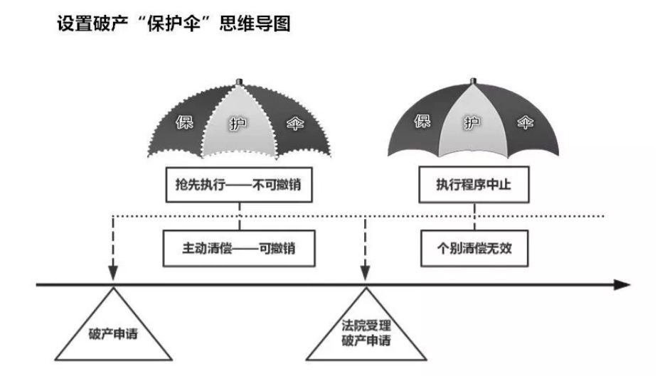 综上,《破产法司法解释二》第15条关于破产撤销权的例外规定一定程度上削弱了破产法对于债务人财产的保护作用,有必要探讨如何在破产申请——受理破产申请这一危机期间防止个别清偿,在现有立法基础上为保护债务人财产提供另一个破产“保护伞”(如图)。