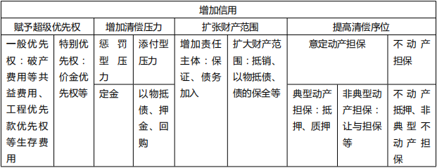 其一,增信措施有四个主要方向。扩张责任财产范围、提升受偿序位、增加清偿压力,以及赋予超级优先权。前三种是通过各方合意基础上,以附加的信用措施赋予相对方更优势的受偿地位,加大债务人清偿压力,促其积极履约;第四种是法律从阶段性的政策考量,给予的特殊主体的特殊照顾。[43]