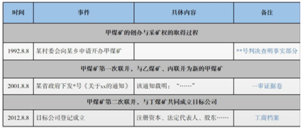 故事重构的方式有多样,视案件的案由、审级、法律争议等,最常见的方式是按照主体、时间顺序、法律关系构成的要件等,如涉及疑难复杂案件,还需要从不同角度多维度地去重构案件事实。如笔者代理的一起涉煤矿的股权转让二审纠纷,因案件背景事实复杂,历时长且关联案件较多,因此,在案件研究过程中,我们多维度重构了该案的事实: