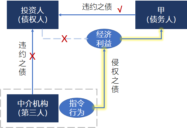 对债权人而言,其既可以选择向中介机构主张违约或侵权的责任,也可向债务人主张违约责任。在最终作出选择之前,其两项权利就像是薛定谔的猫一般,同时处于存在的状态。但当债权人作出选择由债务人承担违约责任之后,债权人对于第三人中介机构的债(无论是违约之债还是侵权之债)则归于消灭,如上图中的两处打叉。不过另有观点认为,债权人对第三人的债并未消灭,因为债权人基于违约或侵权起诉第三人的诉权并未因此受到影响。此处需要明确,诉权(请求权)和诉讼请求能否得到支持是两个完全不同的角度,债权人当然可以持《证券投资合同》和错误指令的证据向法院提起诉讼,但诉权存在并不能够推出债权人债权仍存在的结论。正是因为债权人的损失已不存在,该诉仿佛无源之水无本之木,并不会得到法院支持。