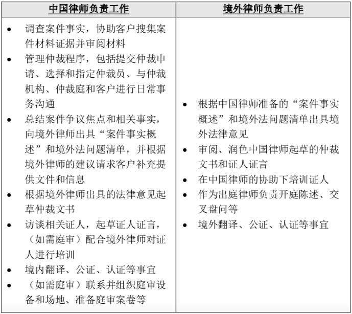 以一个国际仲裁案件为例,中国律师的工作主要是事实证据收集、程序管理和充当客户与境外律师之间的沟通桥梁,而境外律师则主要负责补足中国律师在英文写作和出庭技术方面的短板,如下表所示: