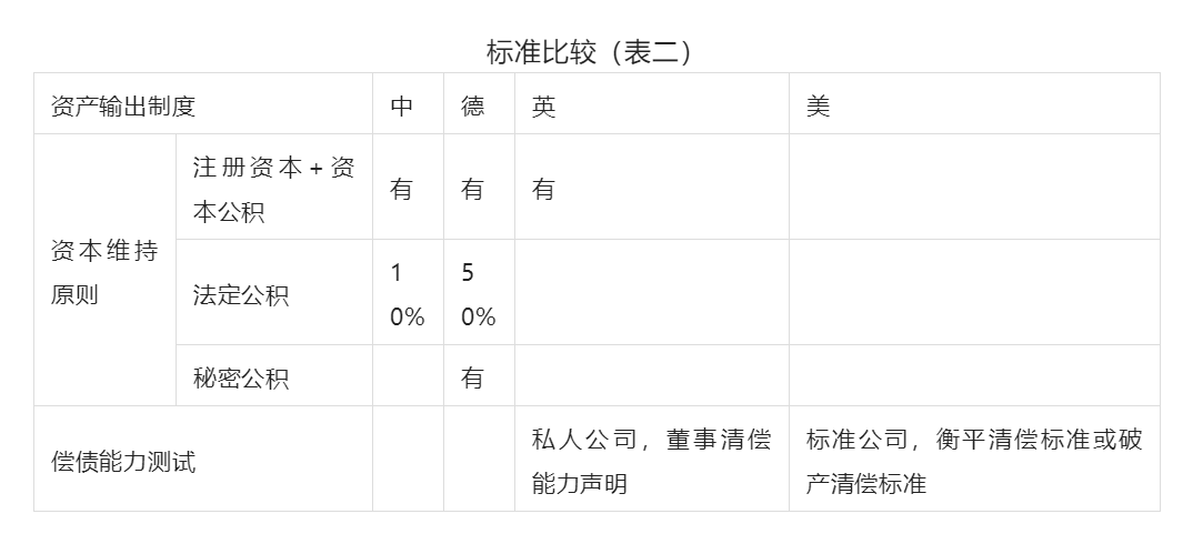 第二个问题,关涉学界争议的采取资本维持原则还是偿债能力测试。准确地说,两者并非并行对立:资本维持原则是为防止公司财产向股东不当流出,应为公司资产流出的整体制度;采取现行的注册资本标准,还是偿债能力标准,抑或其他标准,只是确立不同的资产流出之规制尺度。但为表述方便起见,下面还是采取资本维持原则(注册资本标准)与偿债能力测试的表述,另外公积金制度是资本之上的额外安全垫,其基本逻辑是于资本的基础上增加保护上限,那么资本维持原则对于分配的限制可以随着公积金规则的严格程度而向上累积,[27]为表述便利起见,用资本维持原则统一或注册资本指代。
