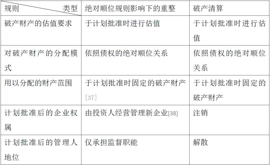 表1绝对顺位规则影响下破产重整与清算的规则对比