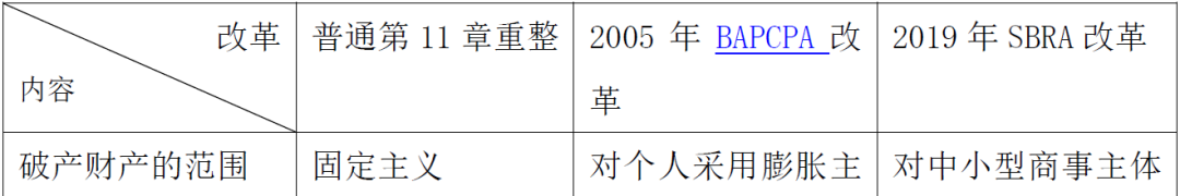 破产财产的界定模式对重整规则的影响在美国破产法的修改历程中也清晰可见:1978年《美国破产法》第11章重整采取的是破产财产固定主义,并对企业和个人同等地使用绝对顺位规则。2005年BAPCPA在第11章中新增中小商事主体重整规则,将个人债务人在破产程序受理后获取的全部财产纳入破产财产,即修正了破产财产的固定主义,使个人重整受预期可支配收入标准而非绝对顺位规则的规制,[75]但其并未将中小企业纳入新模式中,因此改革效果不理想。而2019年SBRA的改革措施则较为激进和彻底,其将破产财产的膨胀主义同样用于中小企业,以实现预期可支配收入标准对中小型商事主体的全面植入。[76]总之,若仔细观察美国破产法的改革脉络,会发现其对破产财产的界定模式与强裁标准的批准要件是联动变化的,膨胀主义的引入正是取消绝对顺位规则的正当性基础。