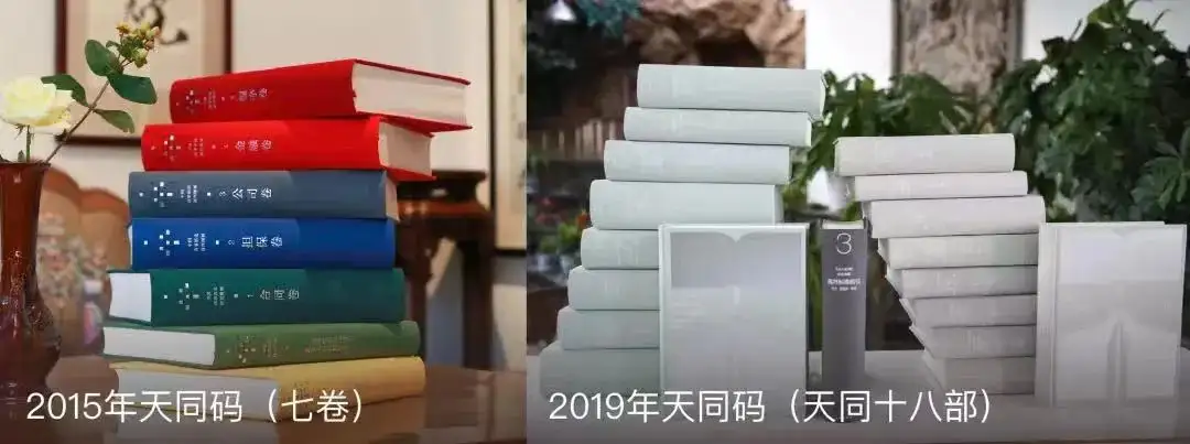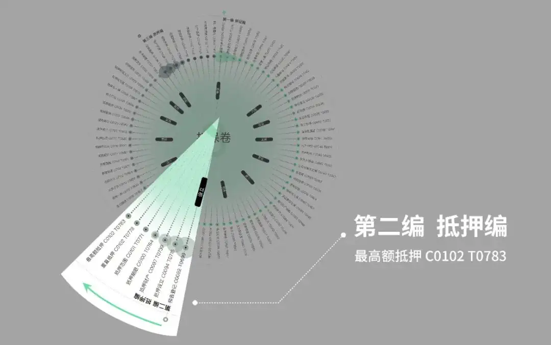2020 年,《天同码》全新推出“天同十八部”,将 2 万条裁判规则凝练于 4200 万字书稿中。我再次受辉哥邀请为这部书稿绘制了商事、民事的可视化目录图表,在创意和想法就之前2015 年设计的《中国商事诉讼裁判规则》(8 卷)的可视化目录图表有一些突破。辉哥对待《天同码》就跟对待自己的孩子一样,所以对可视化的图表要求也高,这一套有 19 卷(含目录 2 卷,判例规则指引 1 卷),每卷页码都在 1000 页以上,要求用一张图能快速检索出来相对应全套书的内容,当然图还要美。检索是整个图表的设计重点,整套书的构成比较复杂,就目录部分分为卷、编、专题、专题案例,相对应的有目录页码、正文页码。经过数次尝试,我们终于把每一卷相对应的具体内容按照大小层级关系合理布局,根据每一卷内容多少来分割专题案例及对应目录页码和正文页码的分布角度。结构虽然复杂,但并不限制对内容的排列,卷与卷之间随心所欲却又以黄金分割线为主线路,整体视觉错落跳动,却始终追寻着理性与秩序。