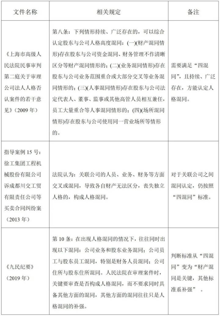 相比此前司法实践中认定人格混同的“四混同”标准,即财产混同、业务混同、人员混同、场所混同,《九民纪要》转变了裁判观点,将“四混同”标准转变为“财产混同是关键,其他标准系补强”。