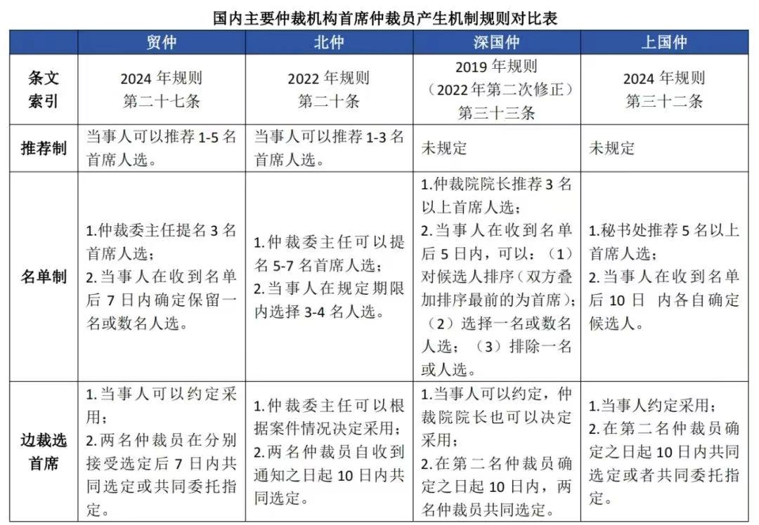 在双方能够达成一致且愿意积极借助名单确定首席的情况下,此种方式具有极其明显的优势:第一,相较于从仲裁员名册中推荐,直接在名单中选择可以极大地提高共同选定首席的概率,例如贸仲规则的“短名单”(short list)方式,即在3名仲裁员中选择或排除1名或数名人选;又如北仲规则规定的在5-7名人选中选定3-4名的方式。第二,由于仲裁机构对其名册中的仲裁员更加了解,因而能够推荐与案件更加匹配的仲裁员,当事人则无需在名册中耗费精力“筛选”合适的首席仲裁员。第三,通过第三方的仲裁机构提供首席候选人名单选定首席,既能避免当事人或仲裁代理人的直接接触,也能保障首席仲裁员产生的透明度和公正性,并实现当事人选定仲裁员的意思自治。