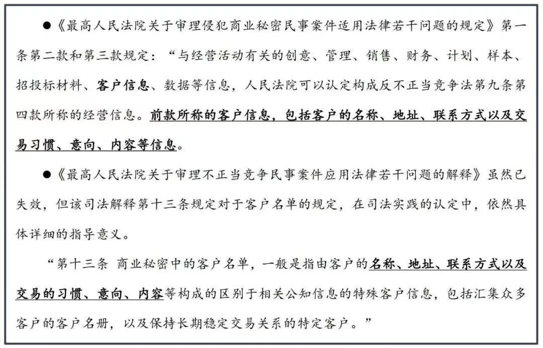 通过解读上述两个文件,构成商业秘密保护的客户名单需包括两部分:一是指向客户的名称、地址、联系方式等信息,即基础信息;二是涵盖客户交易习惯、意向、价格承受能力等信息,即深度信息。