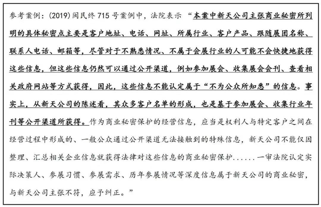 在上述参考案例中,法院即认为权利人的相关客户信息尽管对于不熟悉情况、不属于会展行业的人可能不会快捷地获得这些信息,但仍然可以通过公开渠道,例如参加展会、收集展会会刊、查看相关政府网站等方式获得,不能认定属于“不为公众所知悉”的信息。