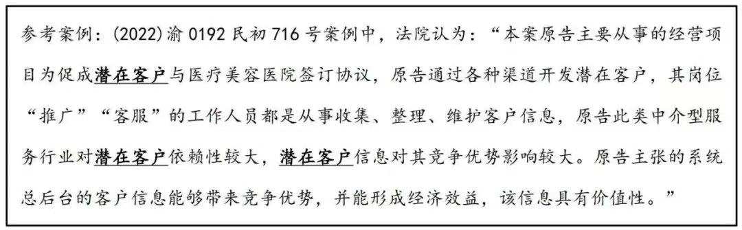 在该案例中,法院认为权利人主要从事的经营项目为促成潜在客户与医疗美容医院签订协议,因此权利人通过各种渠道开发潜在客户的信息对于权利人有较高的价值性,构成权利人的商业秘密。