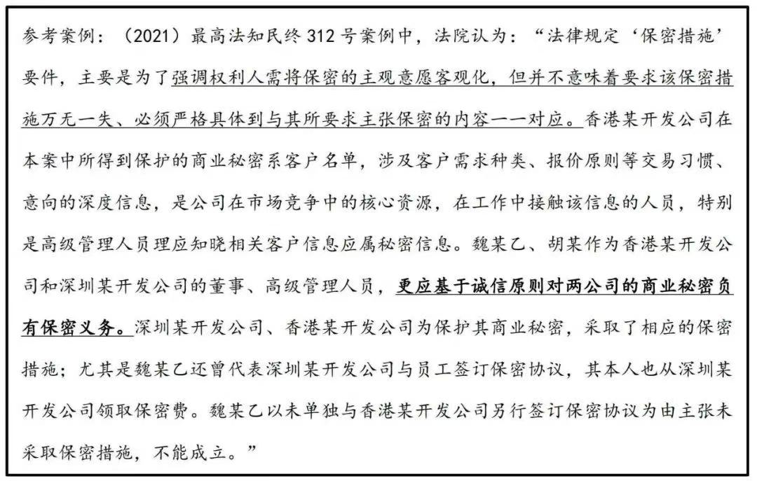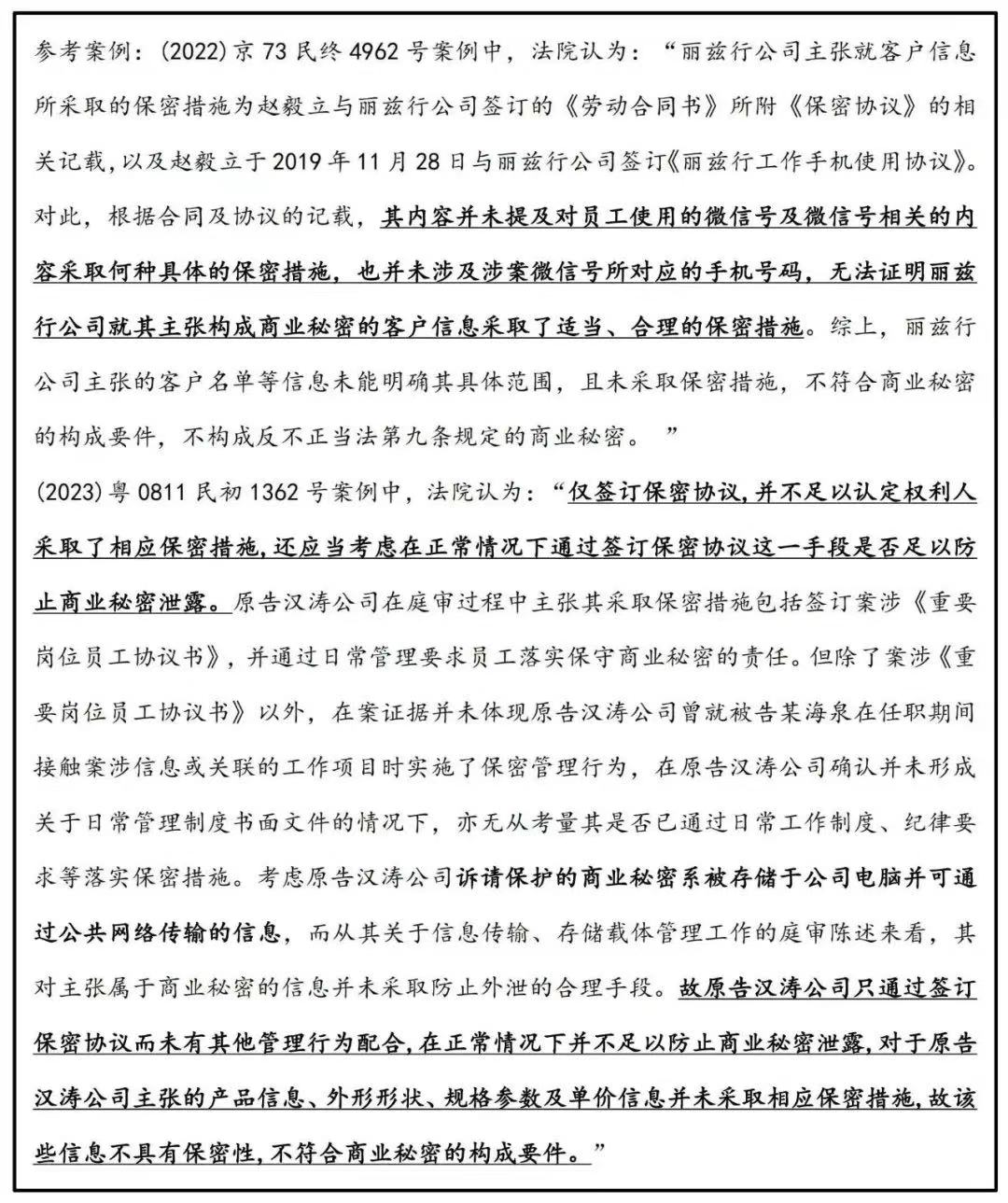 尽管如此,针对客户名单的保密措施需全面贯穿在日常管理的各个环节,实务中,经营者与员工仅签订单一的保密协议或保密协议的约定过于宽泛都不足以认定采取了相适应、合理且具有针对性的保护措施,具体案例如下: