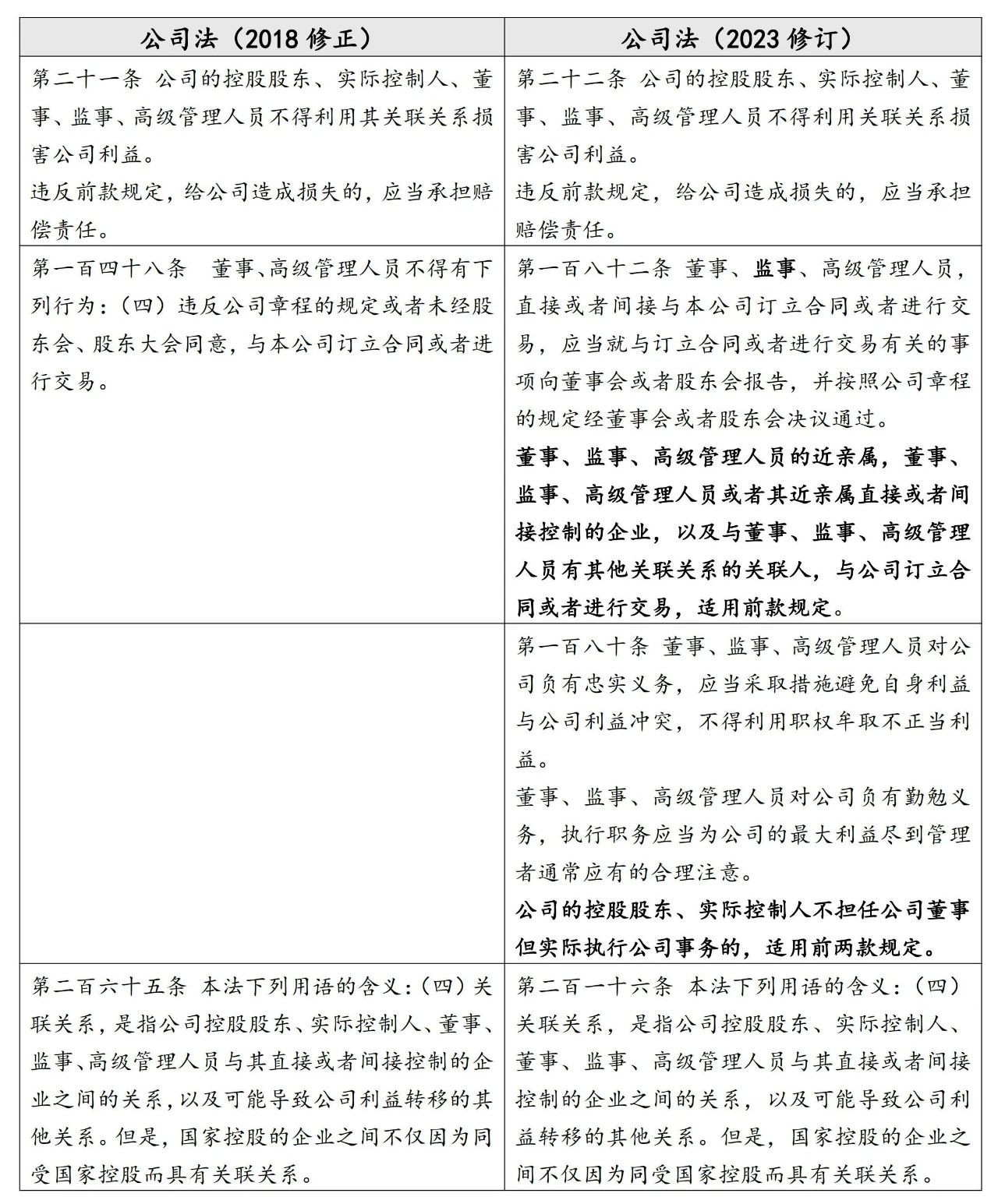 然而,笔者认为由于原公司法存在第二十一条作为一般性规定,具体规定中适用主体范围的扩大并不会导致裁判口径变化。以往公司与监事、实控人、控股股东、董监高或其近亲属控制的企业进行交易的,完全可以引用原公司法第二十一条的一般性规定,结合第二百六十五条关于“关联关系”中“以及可能导致公司利益转移的其他关系”的兜底性定义,判决被告承担相应的赔偿责任,不至于因不存在该等法条而影响裁判结果。检索到的案例亦佐证了上述观点,法院完全能够判决与以上主体控制的公司交易构成关联交易,如上海市第二中级人民法院在(2021)沪02民终3034号判决书中认为“我国公司法规定,未经股东会或者股东大会同意,与本公司订立合同或者进行交易的行为属于董事、高级管理人员的禁止性行为。劳动者在用人单位工作期间,不仅应当遵守劳动法上的规定,更负有遵守法律规定的义务。余柳柳在贝瑞和康公司工作期间,其配偶所设立的公司与贝瑞和康公司建立了代理销售关系,属于自我交易行为,其作为公司的上海大区产前销售部门区域主管,属于公司的高级管理人员,其无证据证明由其配偶与公司建立代理关系经过公司同意,故其行为违反了公司法上的注意义务”,海南二中院在(2019)琼97民终1999号判决中也认为“杨某签订《房产包销补充协议》的行为构成关联交易。《中华人民共和国公司法》第二十一条规定:‘公司的控股股东、实际控制人、董事、监事、高级管理人员不得利用其关联关系损害公司利益。违反前款规定,给公司造成损失的,应当承担赔偿责任。’所谓关联方,是指本企业的董事、监事、高级管理人员及其近亲属,以及这些人员所有或者实际控制的企业。本案中,杨某为原海南美好公司总经理洪流的妻子,杨柯为杨某的哥哥;关联方家乐佳公司的股东为洪流、杨某和李玉杰,法定代表人为洪流;关联方万柯物业的股东为杨某和杨柯,法定代表人为毛燕;关联方海口家乐居实业有限公司股东为杨柯和李玉杰。洪流作为原海南美好公司的总经理,系高级管理人员,与其自己持股的公司或其近亲属及其持股的公司与海南美好公司签订《房产包销补充协议》,构成公司高级管理人员直接或间接控制的关联企业之间的关联交易。其次,《中华人民共和国公司法》第一百四十九条第一款第四项规定,董事、高管人员不得‘违反公司章程的规定或者未经股东会、股东大会同意,与本公司订立合同或者进行交易’。如果董事、高管人员与公司之间的关联交易违反公司章程规定或者未经股东会同意,则该交易无效。罗运景未举证证明其与海南美好公司及关联方签订的《房产包销补充协议》符合海南美好公司章程中关于总经理决定公司发生单项交易的权限规定,亦未举证证明签订该补充协议经过了海南美好公司股东会同意。因此,根据民事诉讼证据规则,罗运景应承担举证不能的不利后果,《房产包销补充协议》应属无效”。