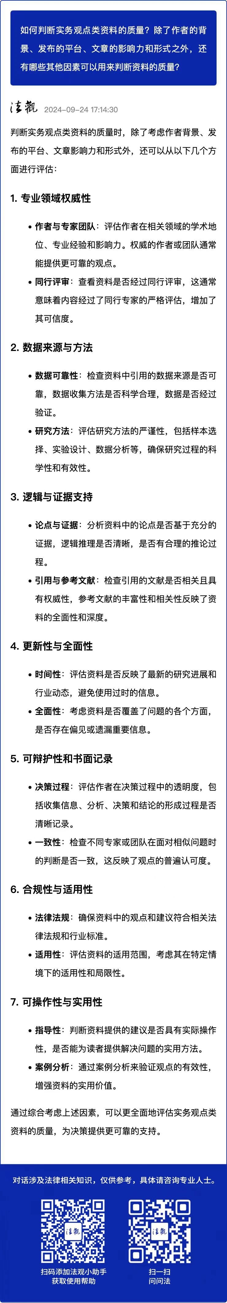 一份高质量的资料很有可能会把待研究问题项下的法律法规、司法实务的态度,以及问题背后的法理全部讲清楚,通过一份资料,我们很可能就可以把待研究问题彻底研究清楚。但是,一份低质量的资料,其总结的法律法规不够全面、梳理的司法实务的态度不够准确、说理不够透彻倒是其次,如果其中的观点有错误,误导我们作出错误的判断,这会造成比较大的麻烦。
