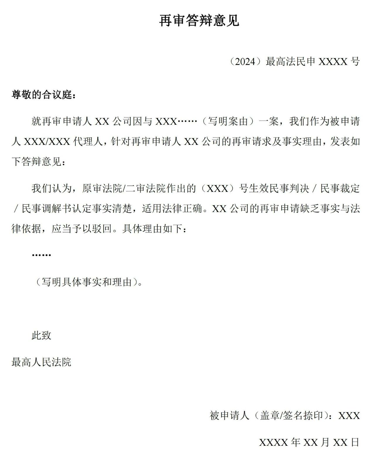 (2)答辩理由部分:再审答辩意见需要兼顾两方面,一方面针对再审申请人的再审请求及事实与理由发表意见,如再审申请人依据《民事诉讼法》第二百一十一条第(一)项“有新的证据,足以推翻原判决、裁定的”之规定申请再审,被申请人可以从证据是否符合再审新证据要求、新证据能否推翻原审认定事实等方面答辩。需要进一步说明的是,如再审申请人提出的再审事实与理由与本案争议焦点关联性不大,或者理由明显不成立,简单回应即可,不应过度纠缠,避免导致案件争议焦点不清晰。另一方面,答辩意见中应强调原生效裁判认定事实清楚,适用法律正确。如原裁判中未对相关争议问题进行充分说理,被申请人可以在答辩意见中补充说明原审情况。